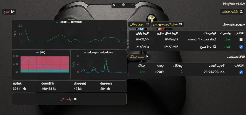 در مرحله بعد برنامه را نصب و اجرا کرده و توکن خود را در کادر مربوط به توکن وارد کنید تا وارد محیط حساب کاربری شوید. اگر سرویس فعال دارید روی گزینه بروزرسانی کلیک کنید تا سرویسهای فعال شما دریافت شود. بعد از دریافت سرویسهای فعال، روی آن کلیک کنید تا نقاط دسترسی(سرورها) دریافت شود. با انتخاب نقطه دسترسی، برنامه را شروع به کار کرده و بازی آنلاین خود را شروع کنید